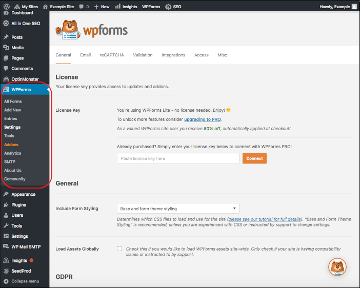 With this plugin enabled, you’ll see a WPForms option near the middle of the left sidebar in your WordPress dashboard. Click Settings to get started: