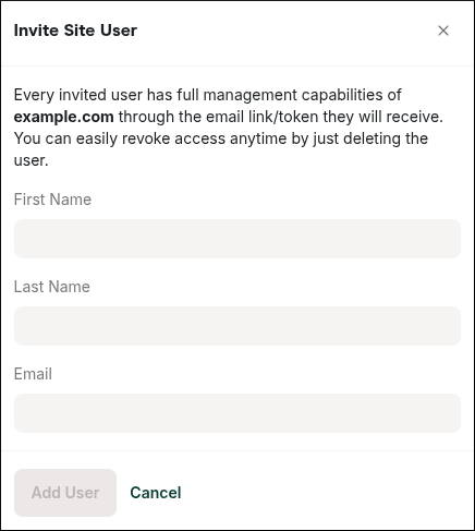 - In the First Name, Last Name, and Email text boxes, type the details for the user you want to invite: