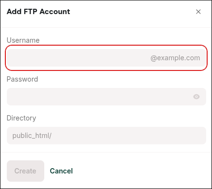 Note: When you create an FTP account for your own use, you can leave the Directory text box empty. This enables you to access everything in your account's public_html directory.