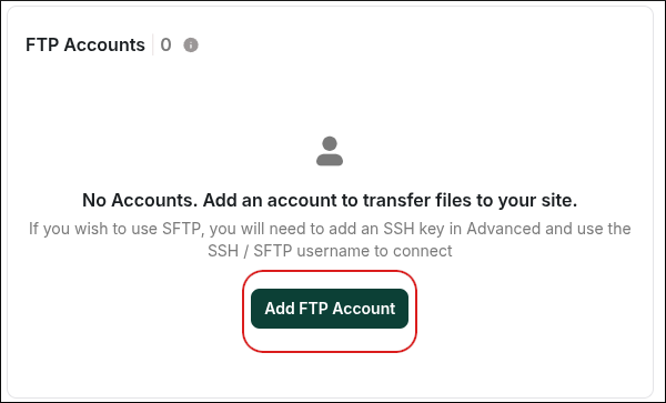 - On the Webcentral dashboard, on the Overview tab, scroll to the bottom of the page, and then in the FTP Accounts section, click Add FTP Account: