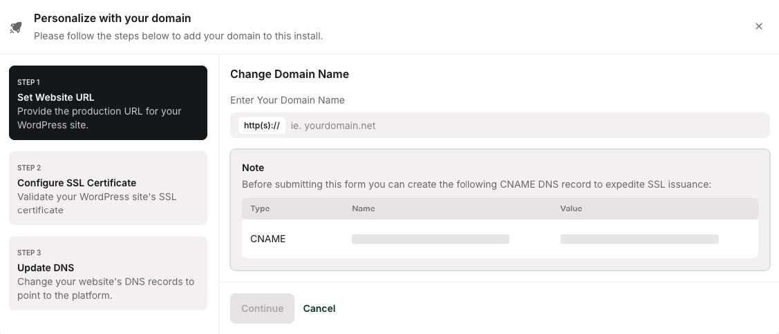 - On the Webcentral dashboard, in the Configure SSL section, click Continue to proceed to the Step 3: Update DNS section.