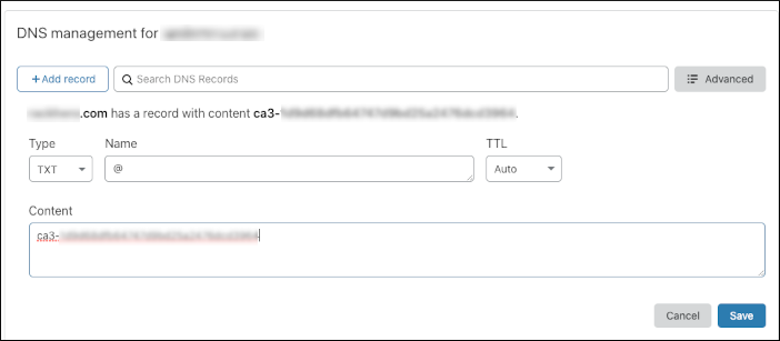 - Create the two TXT records required for your SSL certificate that you obtained in step 7:
