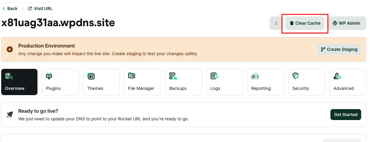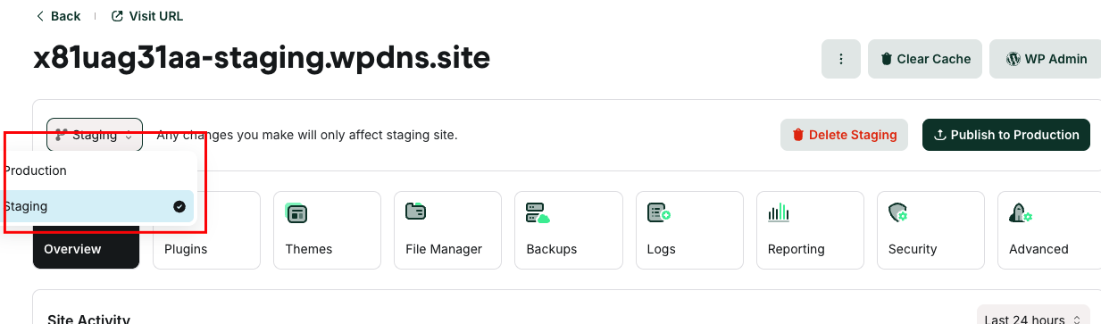 There are Production and Staging status indicators to remind you which site you are currently managing. You can easily change between the production and staging environments using the following list box: