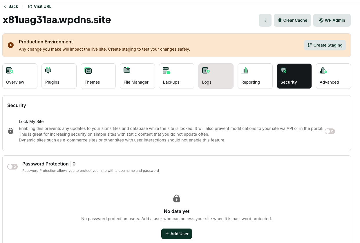 On the Security tab, you can lock your site to prevent any updates to your site's files and database. For example, if you have a site with static content, this feature helps increase site security. On the other hand, if you have a site with dynamic content (such as an e-commerce site), you should not enable this feature.