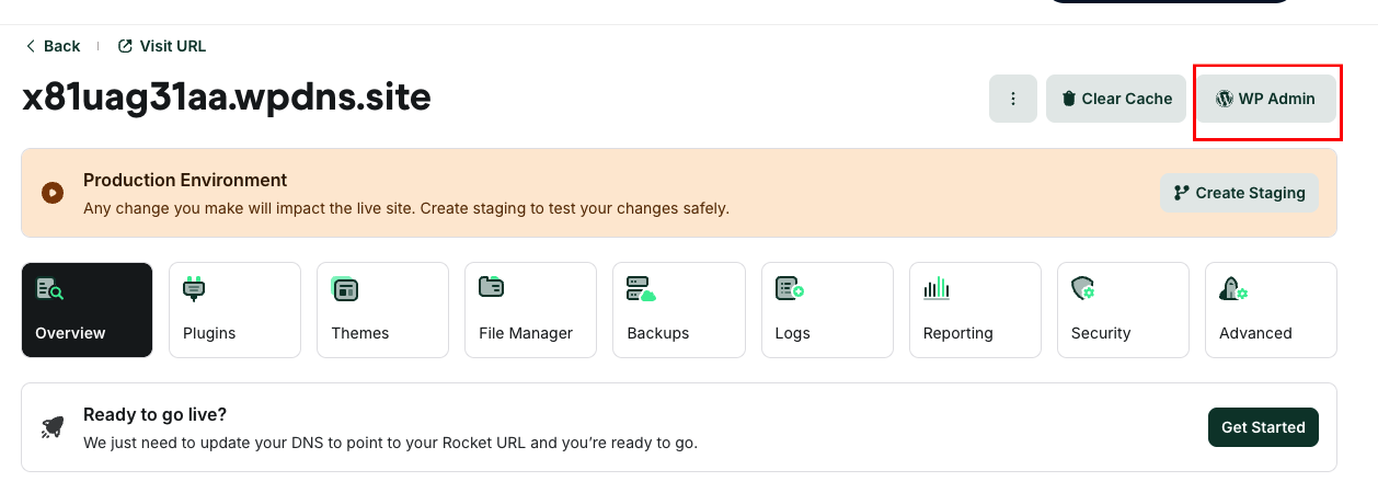 To log in to the WordPress admin dashboard directly, click** WP Admin**: