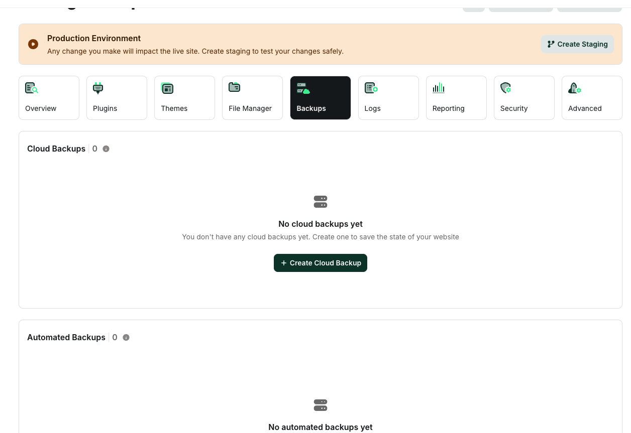 - Cloud Backups: You can create as many cloud backups as you want, depending on your disk space. These are recommended when you’re rolling out a change on your live site that perhaps you couldn’t test on staging.