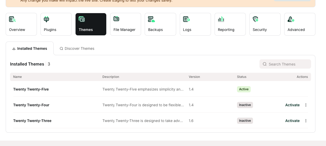 Note: We recommend only having a primary theme and one default WordPress theme installed. Themes must be updated even if they are inactive.